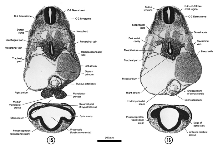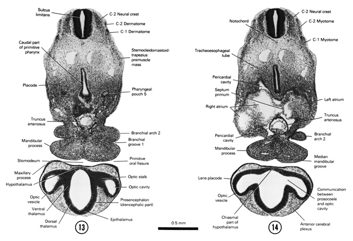 Up to four branchial arches and grooves become distinct in the future lower face and neck region. The stomodeum or primitive mouth is bound by the maxillary and mandibular processes of the first arch. The fourth arch is in the floor of a depressed area called the cervical sinus.