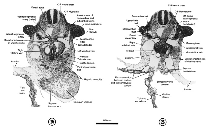 Between the hepatic antrum and the yolk stalk the midgut elongates in the vertical plane. The midportion of the midgut communicates with the yolk sac ventrally through the narrow yolk stalk. Caudal to the yolk stalk the midgut endoderm takes the shape of a small, cylindrical tube with a barely visible lumen. It is surrounded by the splanchnic layer of lateral mesoderm and is suspended in the coelom by a mesentery through which blood vessels reach the gut.