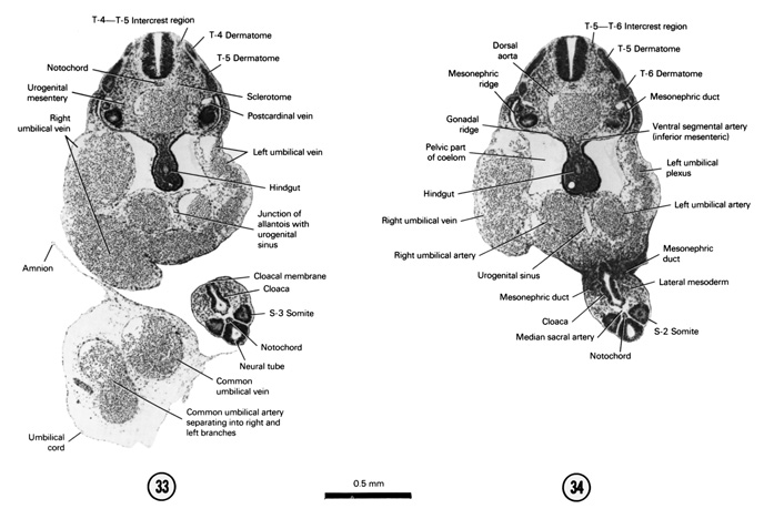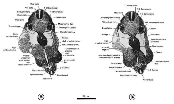 A section through the T-5–T-6 intercrest region and the junction of the mesonephric ducts with the cloaca at the level of the S-2 somite.