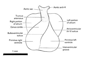 The heart is prominent and located ventrally between the branchial arches and the yolk sac. The atrial and ventricular chambers are large and can be distinguished through the ectoderm.