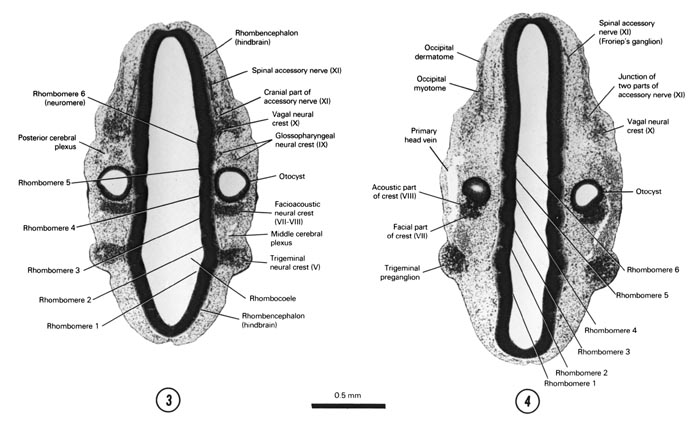 Rhombencephalon—A series of vertical grooves segment its ventrolateral wall into six rhombomeres (neuromeres). This segmentation is partially evident on the outside of the tube as well. In the caudal portion the sulcus limitans separates the rhombencephalon into dorsolateral (alar plate) and ventrolateral (basal plate) areas.
