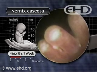 A protective white substance, called vernix caseosa (ver’niks caseo’sa), now encases the fetus,6 protecting the skin from exposure to amniotic fluid.7