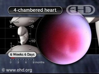 The pacemaker center is already well-established in the right atrium.6 The embryonic heart rate peaks at 7 weeks and now beats approximately 167-175 times per minute.7 This rate gradually declines to about 140 beats per minute at birth.8