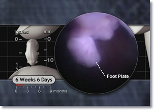 The foot plate and ankle also emerge while toes and metatarsal (met’a-tar’sal) bones begin to form in the feet. Joint development is underway10 and the onset of primary muscle fiber formation indicates the embryo’s muscles are growing.11