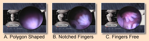 The hands and feet change dramatically between 6 and 7 weeks as separate fingers and toes begin to emerge. At 6 weeks the hand plates develop a subtle flattening between the digital rays. By 6 weeks, 2 days the hand takes on a polygon shape; prominent notches appear between the digital rays by 7 weeks and individual fingers are fully separated by 7½ weeks.12