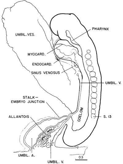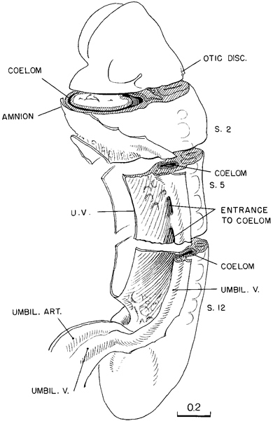 By stage 11 the coelom has become a conspicuous feature. Its distribution in a 13-somite embryo is shown in figure 11-4. In this drawing, slabs have been removed, exposing schematically three representative levels: upper cervical level, somite 4, and somite 8. It will be seen that below the level of somite 6 there is a free opening from the exocoelom into the intra-embryonic coelom in the cleft separating the umbilical vein and the primordium of the abdominal wall from the umbilical vesicle. Caudally, the coelom extends along the side of the intestinal epithelium and spreads caudad with it as the caudal bud continues its differentiation, always remaining widely open to the exocoelom and communicating with the opposite side across and caudal to the junction of the gut and umbilical vesicle. Above, at the level of somites 5 and 6, a trace of the multiple openings from the intra-embryonic coelom into the exocoelom, which originally characterized this system, still persists in the form of a partition marking off an upper opening from the main communication. In the more advanced specimens of this stage, this partition disappears, and there remains but one common opening. Following the coelom rostrally, it is seen again as a closed passage at the level of somite 4, and rostrally from there it soon widens out into the original coelomic space, which now invests the endothelial heart and its gelatinous envelope. It would seem that the first cardiac movements would tend to facilitate the flow of fluid through the coelomic passage.