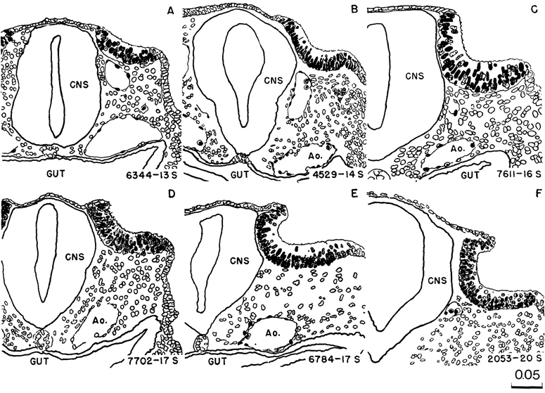 The histological character of the neural tube in a 17-somite embryo is shown in figure 11-10. The sections A and B are taken at two different regions. The upper is at the level of somite 5, cutting obliquely through the spinal cord and thereby exaggerating its ventrodorsal diameter. Compared with the section through the lower level (somite 16), it is larger; its walls are thicker and contain more cells, and the central canal is correspondingly compressed. Another Page 119 feature showing advance in maturity is the migration of the neural crest cells, which have detached themselves from the cells of the dorsal lips at the closure line. At the more caudal level the neural crest cells have not started their migration, and because of their presence the dorsal seam has the gross appearance of a keystone closing in the arched lateral walls. These crest cells do not appear to be proliferating as actively as the other cells of the neural wall, and the wedge-shaped area formed by them is correspondingly paler. It is after their migration that the active proliferation of the crest cells occurs. The progress of neural crest formation has been plotted for stage 11 by Bartelmez and Evans (1926) and by Heuser (1930).
