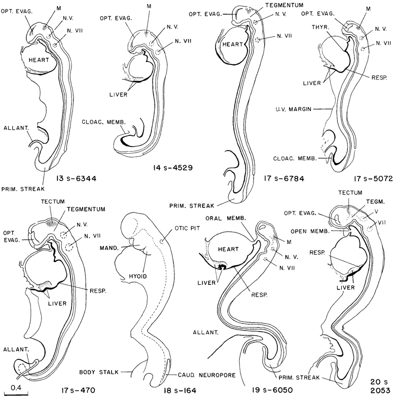 Drawings of eight representative specimens of this stage are shown in figure 11-3. These are enlarged to the same scale, so that the variations in size, posture, and proportions of the specimens can be observed. If it were not for the unavoidable handling of the specimens, it appears likely that there would be but slight variations in these respects. The neural tube is the chief determiner of the form of the embryo at this time. For that reason it is shown in median section, whereby its parts and topography are made more readily recognizable. It will be seen that the dorsal flexure occurs at the transition from the larger and more precocious rostral end of the neural tube to the smaller, newly closed tube that terminates in the caudal neuropore. This flexure can be seen in some degree in all specimens of 17–20 pairs of somites.
