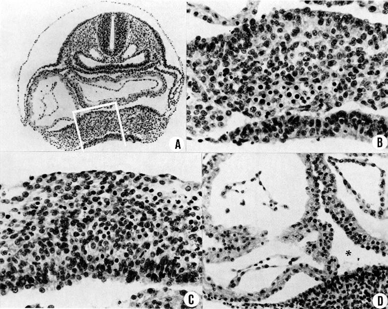 (D) Detail of the myocardium in the same embryo (section 3-3-2). The coelomic fluid (asterisk) comes in contact with the hepatic region below, and it bathes the surface of the folded myocardium above. The surface cells of the myocardium constitute a germinal bed from which specialized myocardial cells are arising. Differentiation follows rapidly. Aside from the germinal bed, there is no surface membrane that can be designated as pericardium, which will appear later.