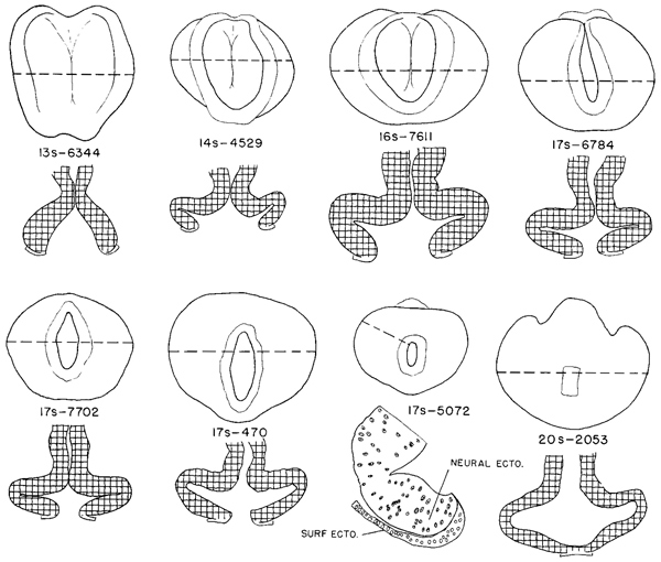 Fig. 11-8. Outline drawings of the rostral end of the neural tube in a series of embryos, showing the steps in the closure of the rostral neuropore. Underneath each specimen is shown a horizontal section taken at the level indicated by the broken line. These show the extent of the optic evaginations. In the section of the 17-somite specimen (No. 5072) only the right side is drawn, showing the demarcation between neural and skin ectoderm. With the exception of No. 5072, all are drawn to the same scale.