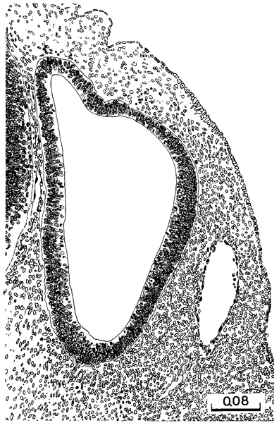 Aside from becoming about one-fourth larger and showing an increased delineation and tapering of its endolymphatic appendage, there are no striking characteristics in the otic vesicle at this stage that are not already present in the more advanced members of the preceding group. If, however, three-dimensional reconstructions are made of them, it is seen that the oval vesicle of stage 13 has become elongated by the ventral growth of the primordium of the cochlear duct. One can also recognize the beginning differential thickening of the walls of the vesicle, the thicker areas marking the location of what are to be the definitive parts of the labyrinth. A section typical of this stage is shown in figure 14-10. It can be compared directly with those illustrated in figure 13-12.