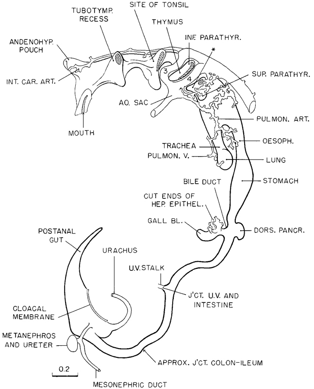Fig. 14-4. The epithelium of the digestive system in a less advanced member of stage 14. Angiogenesis is active in the surrounding mesenchyme, which forms an ensheathing capillary network (not shown in the drawing). The large channels that serve as feeders to the capillaries of the pharyngeal and pulmonary regions are shown. The asterisk indicates the so-called “lateral thyroid.” Based on a Born reconstruction of No. 1380, made by Osborne O. Heard.