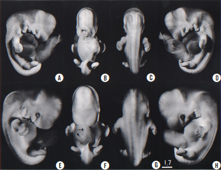 Fig. 17-1. These photographs were selected to show the external form of a less advanced and a more advanced member of stage 17. Between them they represent a range of about two days of development. Among the most constant surface features are the following. The lateral nasal wing now conceals the nasal invagination in profile views. The auricular hillocks on the mandibular arch have smoothed out into the crus and tragus of the external ear. The hillocks on the hyoid arch still have their embryonic form and constitute a three-hillock plate, in contrast to the smoothed-out hillocks in front of the hyomandibular groove. The third pharyngeal arch has disappeared from view. The hand plate is marked with finger rays, very distinct in the more advanced specimens. The foot plate is rounded, and in the more advanced specimens an indication of the great toe is present, but otherwise there isno indication of toe rays. (A-D) No. 8253. (E–H) No. 8101.