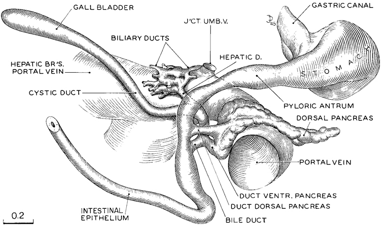 The liver has already taken form as the joint product of angioblastic tissue arising from the coelomic surface cells (fig. 11-6) and of epithelial columns coming from the opposite direction, sprouting from the hepatic evaginations of the gut epithelium (fig. 12-5). The two tissues in this combination undergo continued rapid proliferation, and there is soon produced the typical, large trabeculated epitheliovascular organ known as the liver. The liver shows signs of functional activity important to the embryo from the beginning of blood circulation and thereafter. If its first functional assignment were to be its sole function, there appears no reason that it should not become detached from the gut wall and carry on by itself. It does not, however, Page 215 become detached. There remains an epithelial stem that preserves the continuity between the hepatic epithelium and that of the gut. This stem is partially plexiform, and by stage 17 it is readily recognized as the hepatic duct.