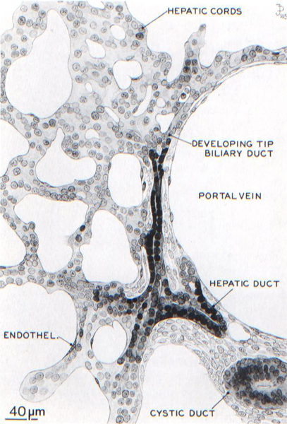 The nature of the abrupt terminal endings of the hepatic duct is illustrated in fig. 17-11. It does not yet penetrate far into the hepatic substance and is found only at the hilum in the connective tissue of the wall of the entering portal vein. At its elongating tips, it is directly continuous with the hepatic epithelium, and its further peripheral growth is accomplished at the expense of the latter, which cell by cell at these tips is transformed into smaller, darkly staining ductal cells. This differentiation keeps step with the formation of the connective tissue coat of the portal vein, along the branches of which the biliary ductal system spreads. Near the hepatic duct, but essentially separate in origin, is the gall bladder and its duct. The hepatic duct and the plexiform terminations of its biliary tributaries, in the reticulum along the wall of the portal vein, have been reconstructed in three dimensions and are shown in figure 17-10. Information on the development of the intrahepatic biliary ducts is available (Koga, 1971).