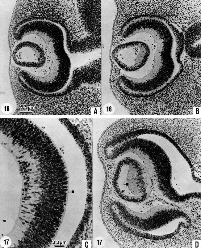Fig. 17-13. These photomicrographs show the characteristics of the eye, as seen under the microscope, in stages 16 and 17. In stage 16 the lens vesicle has a large lumen. One can see rather sharply demarcated the section of its wall that is to become the lens disc, distinct from the epithelium that is to remain as the thin epithelial layer over the front of the lens in the mature eye. In stage 17 the lens disc, in the histogenesis of lens fibers, becomes much thicker and encroaches upon the lens cavity, reducing it to a crescentic shape. Another decisive advance is the formation of the internal neuroblastic layer of the retina by migration from the primary zone (O'Rahilly, 1966), as seen in C. The starting point of this migration runs occurs at about the location of the future macula. In the next stage the spread is much wider. (A) No. 6509, 12-1-3. (B) No. 6507, 7-2-3. (C) No. 6520, 22-2-3. (D) No. 6521, 24-3-4. A, B, and Dare at the same magnification.