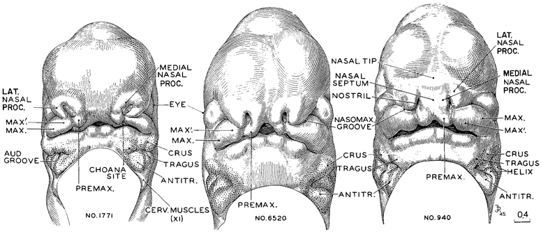 By stage 17 the face has emerged as a consequence of the enlargement and fusion of several growth centers which are generally spoken of as facial processes. As they merge, these produce structures recognizable as the definitive nose and upper jaw. The important steps in this transformation are illustrated in figure 17-3. Ever since the pioneer descriptions of His, they have been designated as facial processes. To call them that, however, has the disadvantage of oversimplification. In reality they are not prolongations having free ends that meet in the nasal region; nor is the ectoderm absorbed over their abutting surfaces. In transverse series of embryos the facial region is likely to be cut coronally (i.e., tangentially), which gives an exaggerated idea of their length. The alternate sections of the series used by His are now in the Carnegie Collection, catalogued as No. 7317. It is more precise to speak of these structures as swellings or ridges that correspond to centers of growth in the underlying common mesenchyme. The furrows that lie between them on the surface are smoothed out as the proliferation and fusion of the growth centers fill in beneath: i.e., merging occurs rather than fusion (Patten, 1961). Under these circumstances no ectoderm requires absorption; it is simply flattened out in adaptation to the changed surface. This is in confirmation of the observations of Peter (1913), who found that the grooves separating the facial processes do not disappear as a result of the fusion of their edges. Instead they become more shallow and eventually smooth, as the increase in mass produces a new surface level. This point is to be kept in mind in analysis of the factors involved in the deformities that accompany harelip.