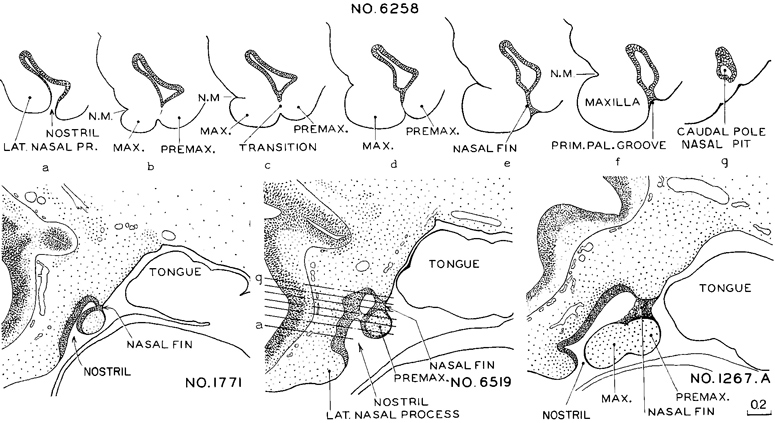 The sagittal drawings in the lower row show less-advanced, intermediate, and more-advanced representatives of this stage, a period of rapid transformation in the nasal region. It is to be noted that the primary characters of this respiratory by-pass are acquired in miniature and before the attainment of its topographical relation to the tongue.