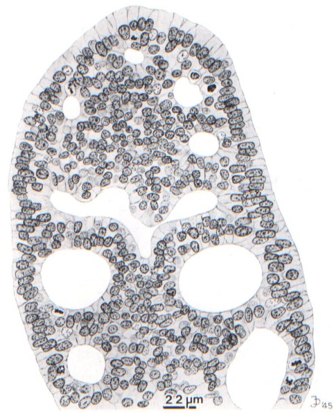 Fig. 17-9. Section through duodenal epithelium of No. 6520. (Cf. fig. 17-8.) In its proliferative activity it forms diverticula opening from the central lumen and also isolated follicles. Because of the exuberant growth of its epithelium there are produced the two fusiform enlargements of the duodenum, above and below the combined pancreatic and bile ducts. Drawing made by James F Didusch. Section 48-3-3.