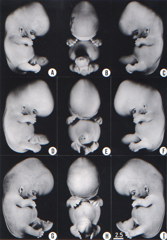 Fig. 20-1. Photographs of three embryos belonging to stage 20. A slight bend is present at the elbow, and the hands are curving medially over the cardiac region. Top row, No. 7274. Middle row. No. 7906. Bottom row. No 8157. All views are at the same magnification.