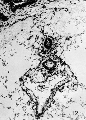 Fig. 7-7. General view of the tissues at and near the implantation site (No. 7802, stage 7). A portion of the myometrium can be seen above. A cystic gland is present on the left-hand side of the mucosa. A large, branched vascular space partly surrounds the border zone of the specimen. Early decidua is present. Section 44-3-5.