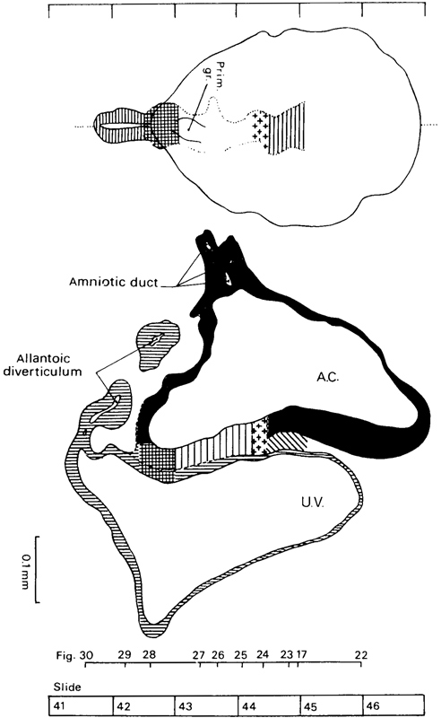 Allantoic diverticulum (Figs. 7-4 and 7-12). Because of the considerable difficulty in finding a convincing example of an allantoic diverticulum at stage 6, it is safer to assume for the present that the allantoic primordium first appears during stage 7, where it can be identified with a reasonable degree of certainty in such embryos as No. 7802, Bi 24, and Manchester 1285. In his discussion of the diverticulum of the umbilical vesicle found in Peh. l-Hochstetter (stage 8), Florian (1930a) referred to “the allanto-enteric diverticulum since its proximal part represents the later hind-gut, its distal portion the entodermal allantoic canal.” In other words, “the very early primordium of the allantois does not arise directly from the hind-gut... but from an allanto-enteric diverticulum. The orifice of this diverticulum later comes to form a part of the hindgut. It is only in the stage [10] when the insertion of the umbilical stalk has reached the ventral wall of the embryonic body that the allantois can be said to arise directly from the hind-gut...” (ibid.). This distinction was based largely on the relationship of the cloacal membrane to the orifice of the diverticulum. A comparison, however, of the wider choice of specimens now available would seem to indicate that, in stages 7-10, the diverticulum in question may be either allantoic or allanto-enteric at any given stage, as indicated in Table 7-1 and figure 7-3.