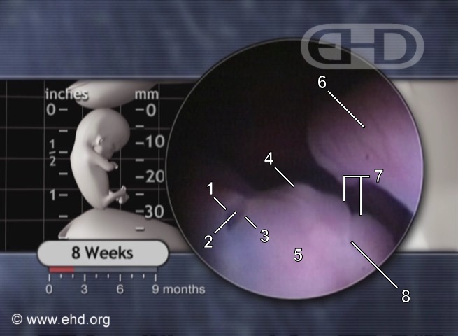 Note:The upper and lower eyelids are rapidly growing over the surface of the eye as pregnancy reaches 8 weeks. They will fuse together and completely cover the eye before 9 weeks. The overbite present just a few days ago is already significantly diminished.Label Key:1. upper eyelid 2. eye 3. lower eyelid 4. nose 5. cheek 6. dorsal surface of right hand 7. upper and lower lips 8. corner of mouth | ||
