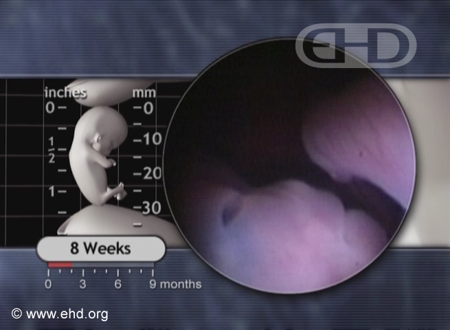 The upper and lower eyelids are rapidly growing over the surface of the eye as pregnancy reaches 8 weeks. They will fuse together and completely cover the eye before 9 weeks. The overbite present just a few days ago is already significantly diminished.