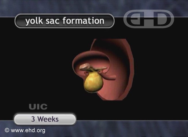 Label Key:1. amnion 2. cephalic end of the embryo (meaning "toward the head") 3. yolk sac 4. embryo proper 5. amniotic cavity 6. caudal end (meaning "toward the tail") 7. umbilical cord | ||