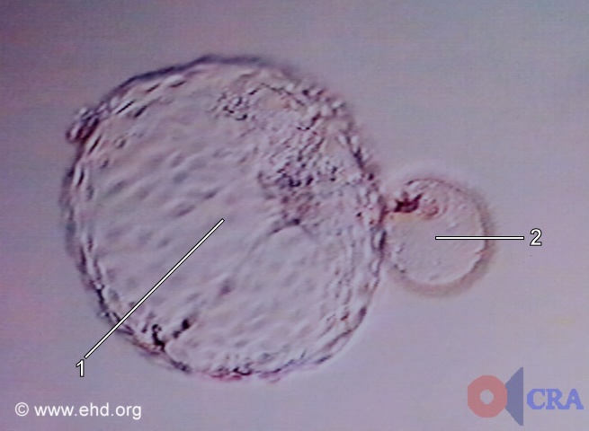 Note:It's hard to believe but this big embryo once fit in that small shell.Label Key:1. embryo at the blastocyst stage 2. empty zona pellucida |