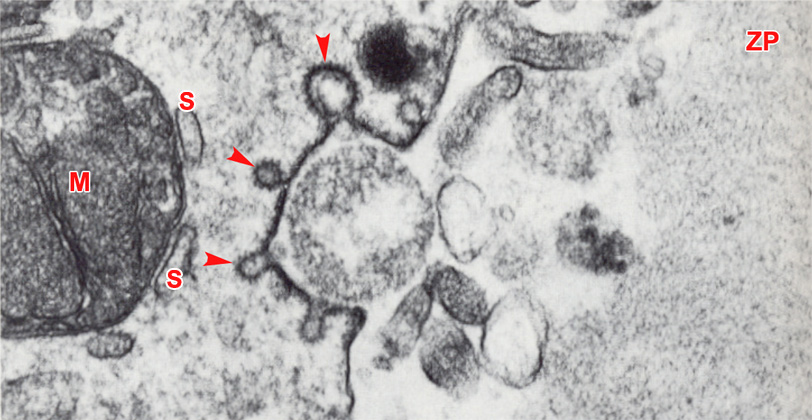 Keywords: cell membrane, cortical granule(s), exocytosis, micropinocytotic caveolae, mitochondria, smooth endoplasmic reticulum, stage 1a embryo, zona pellucida
