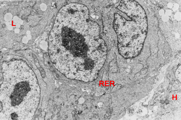 Low power TEM of a stage 3 embryo in vitro through the epiblast adjacent to the hypoblast (H). 145-170 hours post-insemination (original magnification x10,800). Note lipid droplets (L) and rough endoplasmic reticulum (RER). The RER is very long in the epiblast cells adjacent to the hypoblast generally running along the long axis of the mitochondria or bridging the cytoplasm between adjacent mitochondria. In some cells a cisternum of RER is closely apposed to the parallel membrane of the Golgi complex. In some regions the RER is continuous with annulate lamellae. Lipid globules are common. Some are closely associated with mitochondria.