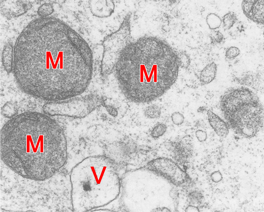 Very high power TEM of an early stage 2 embryo in vivo, (original magnification x40,000). Mitochondria (M) are rounded with peripherally located cristae. Small vesicles of the smooth endoplasmic reticulum are in close association with the mitochondria. Larger free vesicles (V) of the endoplasmic reticulum are also present.