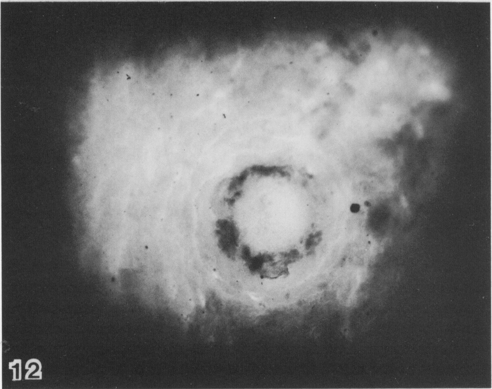 View of the implantation site, as seen in the cleared celloidin block. The irregular, dark ring is caused by maternal blood within the trophoblast lacunae, and is a characteristic feature of subdivision 5c, as it has been defined by Hertig, Rock, and Adams.