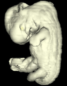 Keywords: C-6 spinal ganglion, angle of mouth, dorsal thalamus, edge of lateral ventricle, edge of shoulder, external layer of retina, hypoglossal nerve (CN XII), inferior parathyroid gland, isthmus of thyroid gland, junction of external and internal carotid arteries, laryngeal condensation, laryngeal pharynx, lens vesicle cavity, marginal ridge, optic chiasma (chiasmatic plate), optic sulcus, oronasal cavity, precardinal vein, ventral thalamus, vitreous cavity