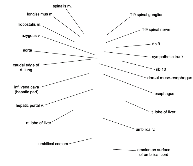 Keywords: T-9 spinal ganglion, T-9 spinal nerve, amnion on surface of umbilical cord, aorta, azygos vein, dorsal meso-esophagus, esophagus, hepatic portal vein, iliocostalis muscle, inferior vena cava (hepatic part), left lobe of liver, longissimus muscle, lung, right, rib 10, rib 9, right lobe of liver, spinalis muscle, sympathetic trunk, umbilical coelom, umbilical vein