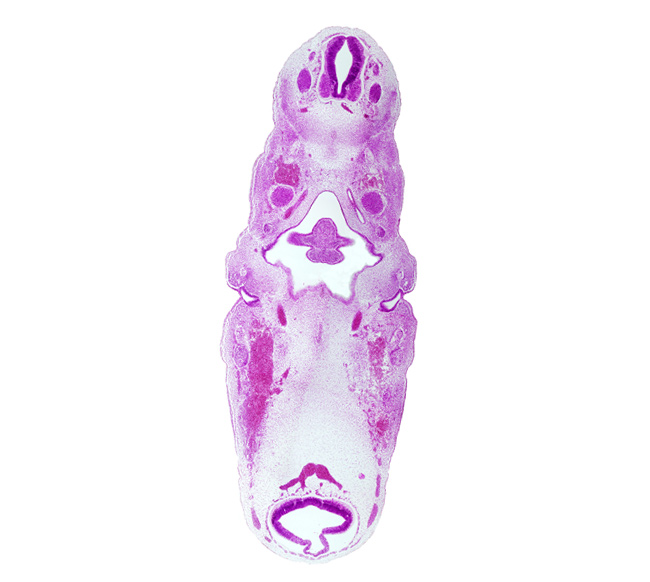 Keywords: C-2 / C-3 interganglion region, C-2 spinal ganglion, aortic arch 3, auricular hillock, basilar artery bifurcation, copula of tongue, dorsal aorta (internal carotid artery), facial nerve (CN VII), glossopharyngeal nerve (CN IX), hypopharyngeal eminence of tongue, inferior ganglion of vagus nerve (CN X), internal carotid artery, junction of aortic arch 3 and dorsal aorta, laryngeal pharynx, mandibular nerve (CN V₃), maxillary nerve (CN V₂), mesencephalon (M2), mesencoel (cerebral aqueduct), nasopharynx, notochord, ophthalmic nerve (CN V₁), origin of mesencephalon artery, pharyngeal groove 1, pharyngeal pouch 1, pharyngeal pouch 2, primary head vein, vertebral artery
