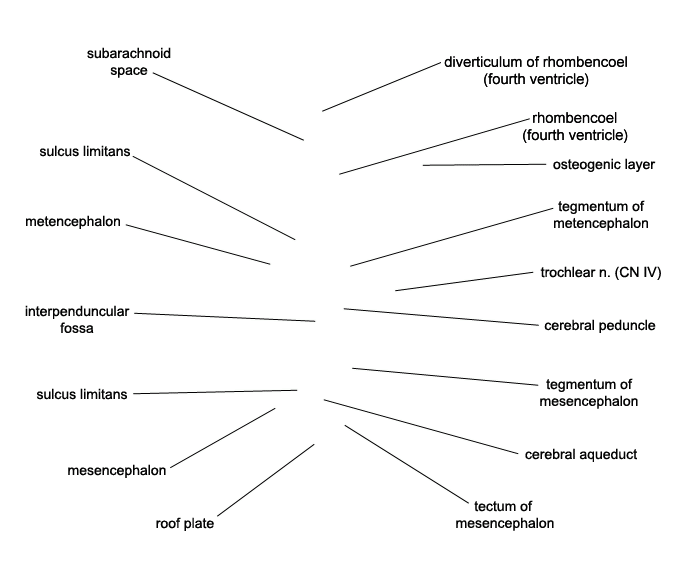 Keywords: cerebral aqueduct (mesocoele), cerebral peduncle, diverticulum of rhombencoel (fourth ventricle), interpeduncular fossa, mesencephalon, metencephalon, osteogenic layer, rhombencoel (fourth ventricle), roof plate, subarachnoid space, sulcus limitans, tectum of mesencephalon, tegmentum of mesencephalon, tegmentum of metencephalon, trochlear nerve (CN IV)