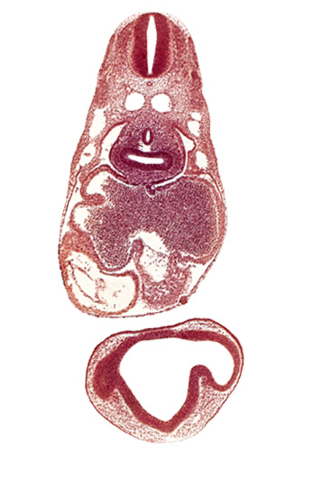 Keywords: caudal edge of optic vesicle, common atrioventricular canal, common cardinal vein, dermatomyotome 6 (C-2), dermatomyotome 7 (C-3), esophagus primordium, left atrium, notochord, optic part of retina, pericardial cavity, pericardioperitoneal canal (pleural cavity), postcardinal vein, primary interatrial septum (septum primum), prosencoel (third ventricle), right atrium, right lung bud, sinus venosus, ventral thalamus (diencephalon)