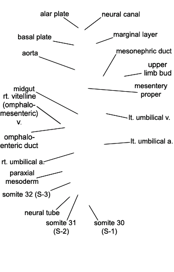 Keywords: alar plate(s), aorta, basal plate, left umbilical artery, left umbilical vein, marginal layer, mesentery proper, mesonephric duct, midgut, neural canal, neural tube, omphaloenteric duct, paraxial mesoderm, right umbilical artery, right vitelline (omphalomesenteric) vein, somite 30 (S-1), somite 31 (S-2), somite 32 (S-3), upper limb bud