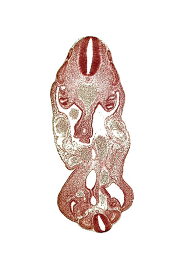 Keywords: T-1 spinal ganglion primordium, allantois, aorta, coelom, dermatomyotome 13 (T-1), dermatomyotome 14 (T-2), dermatomyotome 27 (L-3), gonadal epithelium, hindgut, left common iliac artery, left umbilical artery, lower limb bud, mesonephric ridge, neural canal, notochord, origin of primary intestinal plexus artery, rectum primordium, sclerotome, urogenital sinus, urorectal septum