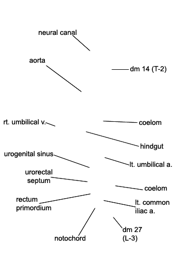 Keywords: aorta, coelom, dermatomyotome 14 (T-2), dermatomyotome 27 (L-3), hindgut, left common iliac artery, left umbilical artery, neural canal, notochord, rectum primordium, right umbilical vein, urogenital sinus, urorectal septum
