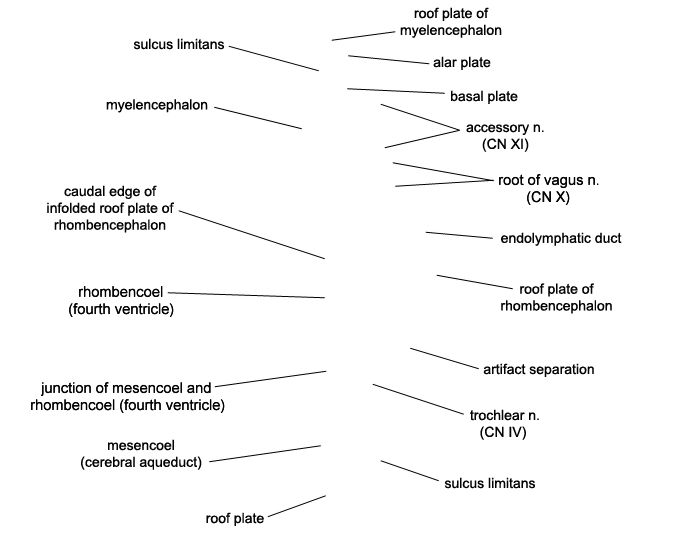 Keywords: accessory nerve (CN XI), alar plate(s), artifact separation(s), basal plate, caudal edge of infolded roof plate of rhombencephalon, endolymphatic duct, junction of mesencoel and rhombencoel (fourth ventricle), mesencoel (cerebral aqueduct), myelencephalon, rhombencoel (fourth ventricle), roof plate, roof plate of myelencephalon, roof plate of rhombencephalon, root of vagus nerve (CN X), sulcus limitans, trochlear nerve (CN IV)