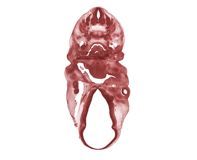 Keywords: C-4 spinal nerve, C-5 spinal ganglion, adenohypophysial pouch, artifact(s), arytenoid swelling, dorsal sulcus, edge of optic stalk (CN II), intraretinal space (optic vesicle cavity), laryngeal pharynx, marginal ridge, maxillary vein, middle sulcus, optic cup cavity, pharyngeal groove 1, pharyngeal pouch 2, precartilage condensation of pharyngeal arch 1 (Meckel), retropharyngeal space, spinal accessory nerve (CN XI), third ventricle, vagus nerve (CN X), ventral (hypothalamic) sulcus, vertebral artery