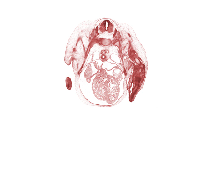 Keywords: T-1 intercostal nerve, T-1 spinal ganglion, T-2 intercostal nerve, aorticopulmonary septum region, artifact fracture(s), axillary artery, central canal, head of rib 1, left atrium, left precardinal vein, left ventricle, musculi pectinati in right atrial wall, neural arch, phrenic nerve, retro-esophageal space, rib 2, rib 3, right precardinal vein, right ventricle, subarachnoid space, transverse sinus, undivided truncus arteriosus (proximal outflow tract)