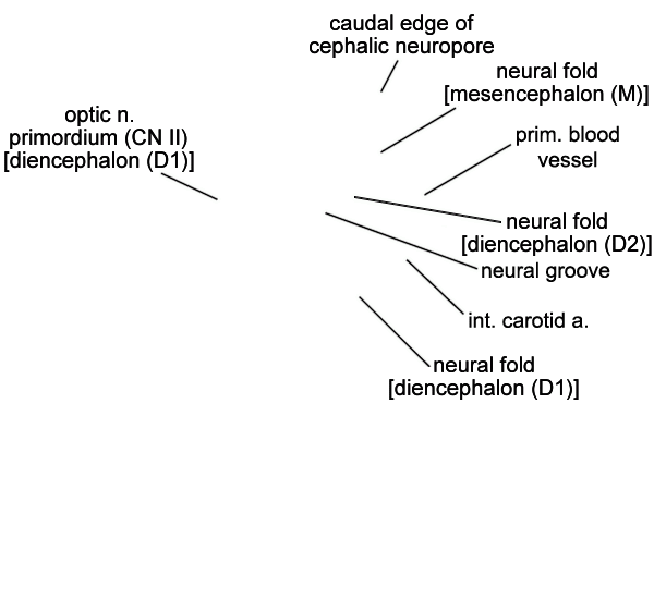 Keywords: caudal edge of cephalic neuropore, internal carotid artery, neural fold [diencephalon (D1)], neural fold [diencephalon (D2)], neural fold [mesencephalon (M)], neural groove, optic nerve primordium (CN II) [diencephalon (D1)], primordial blood vessel(s)