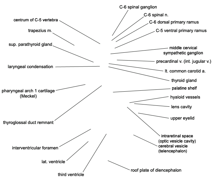 Keywords: C-5 ventral primary ramus, C-6 dorsal primary ramus, C-6 spinal ganglion, C-6 spinal nerve, centrum of C-5 vertebra, cerebral vesicle (telencephalon), hyaloid vessel(s), interventricular foramen, intraretinal space (optic vesicle cavity), laryngeal condensation, lateral ventricle, left common carotid artery, lens cavity, middle cervical sympathetic ganglion, palatine shelf, pharyngeal arch 1 cartilage (Meckel), precardinal vein (internal jugular vein), roof plate of diencephalon, superior parathyroid gland, thyroglossal duct remnant, thyroid gland, trapezius muscle, upper eyelid