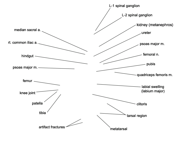 Keywords: L-1 spinal ganglion, L-2 spinal ganglion, artifact fracture(s), clitoris, femoral nerve, femur, hindgut, kidney (metanephros), knee joint, labial swelling (labium major), median sacral artery, metatarsal(s), patella, psoas major muscle, pubis, quadriceps femoris muscle, right common iliac artery, tarsal region, tibia, ureter