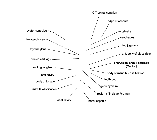 Keywords: C-7 spinal ganglion, anterior belly of digastric muscle, body of mandible ossification, body of tongue, cricoid cartilage, edge of scapula, esophagus, geniohyoid muscle, infraglottic cavity, internal jugular vein, levator scapulae muscle, maxilla ossification, nasal capsule, nasal cavity (nasal sac), oral cavity, pharyngeal arch 1 cartilage (Meckel), region of incisive foramen, sublingual gland, thyroid gland, tooth bud(s), vertebral artery