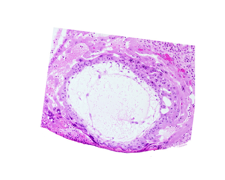 Keywords: chorionic cavity, cytotrophoblast, extra-embryonic mesoblast, primary umbilical vesicle cavity, uterine cavity